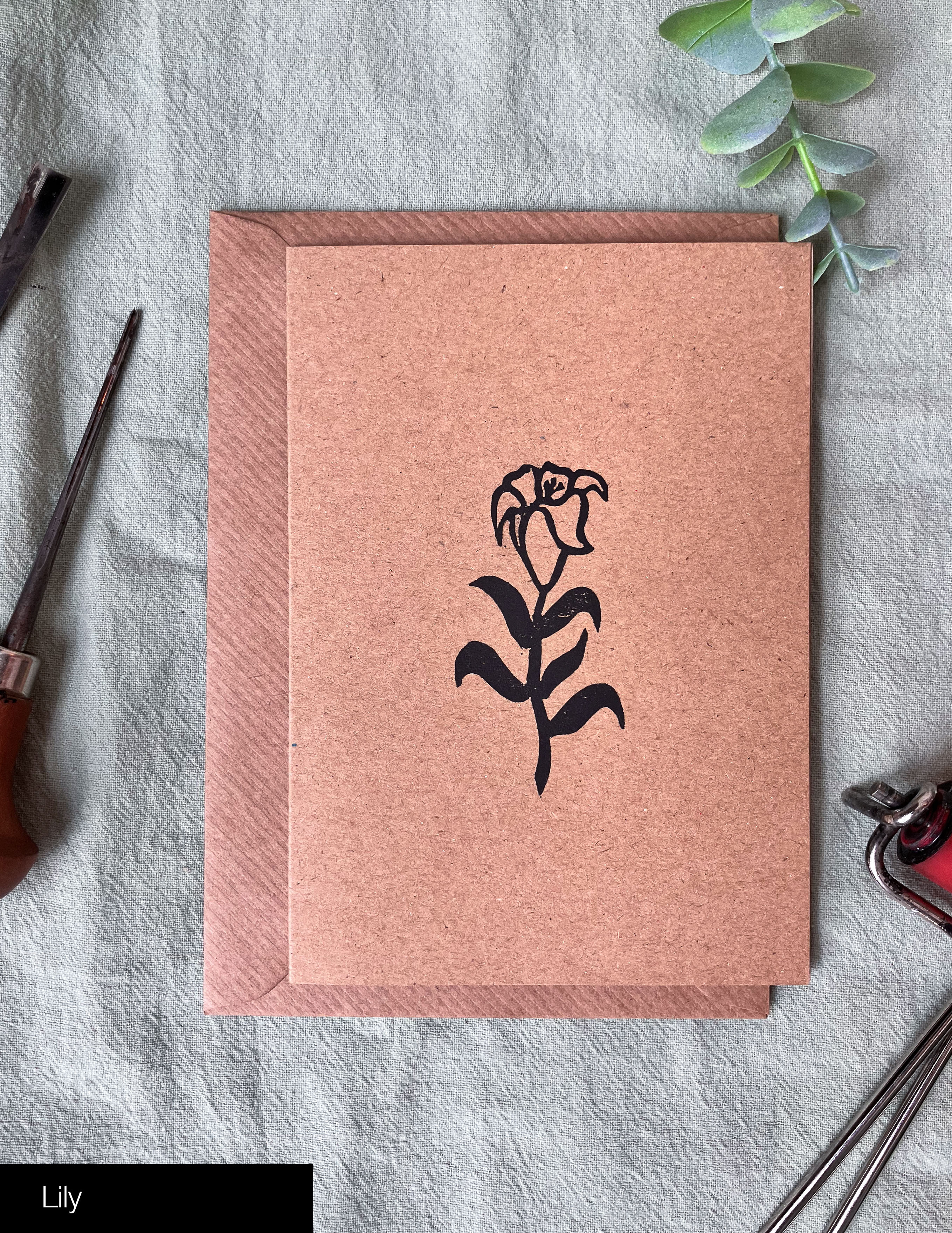 Hand carved lino print A6 greetings cards. Designed, linocut and printed by hand on 280gsm kraft paper, using Cranfield Caligo Safe Wash Relief Ink.